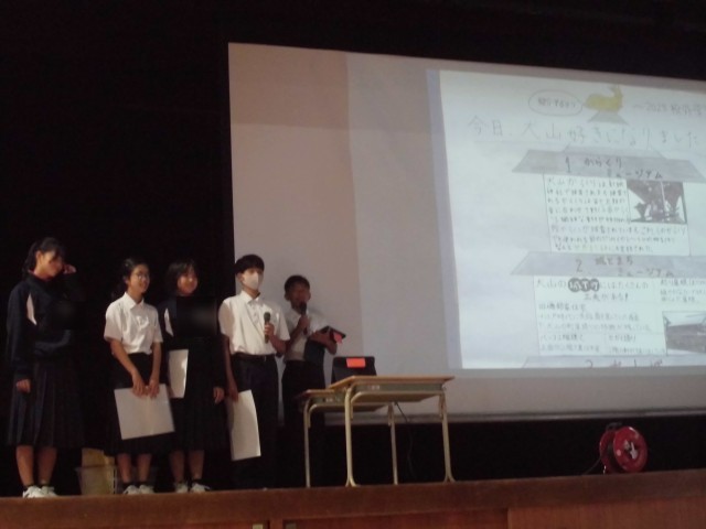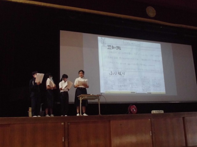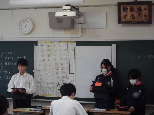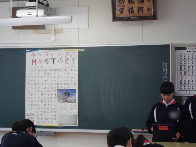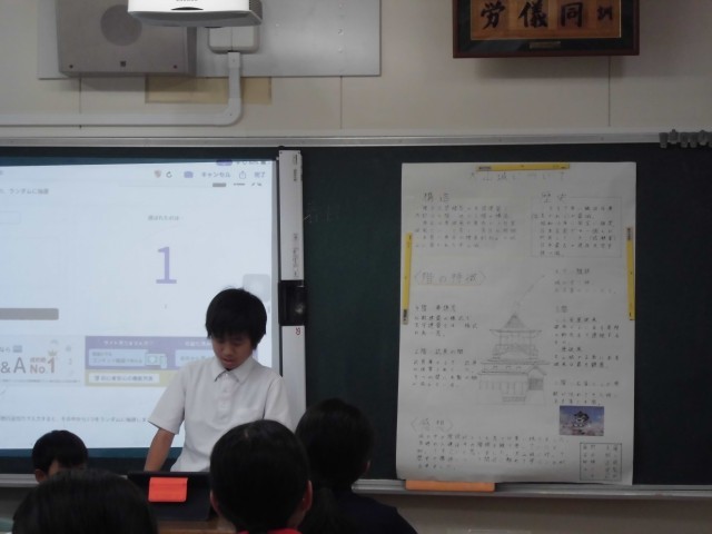 本日は校外学習のまとめの発表会を行いました。1時間目にはクラス内で各グループごとに発表を行い、5時間目にはクラスから投票で選ばれた代表グループの発表を聞きました。どのグループも、自分たちが現地で見聞きしたことを工夫してポスターにまとめ上げられており、なるべくセリフを見ずに前を向いて話そうとする生徒も見られました。ポスターのデザインや発表が良かったグループには賞状が贈られました。お互いに発表を聞くことで、良いプレゼンテーションとは何かを学ぶ機会となりました。