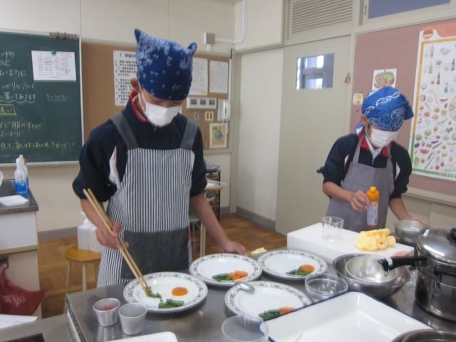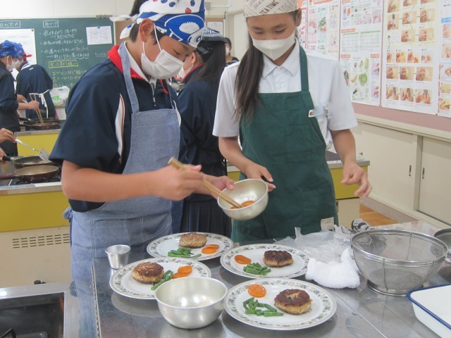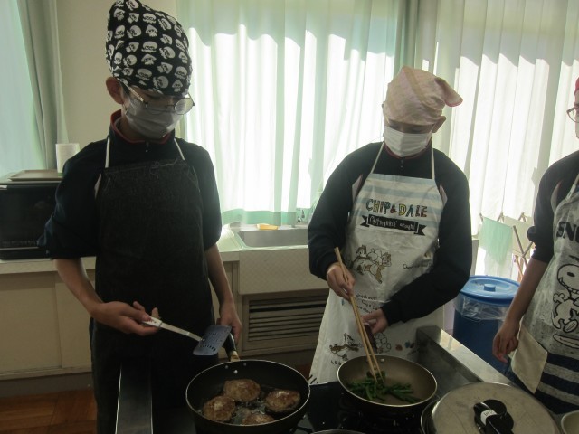 本日、1年A組が家庭科の授業で、調理実習をおこないました。メニューは、ハンバーグと付け合わせのにんじんのグラッセ・いんげんのソテーです。事前に役割分担を決め、この日のために準備をしてきました。慣れない計量に苦戦している姿もありましたが、作っている中で、仲間と協力して調理している様子が見られました。今回の実習をきっかけに、自分の手で作る楽しさを、もっと身近に感じてもらえたら嬉しいです。