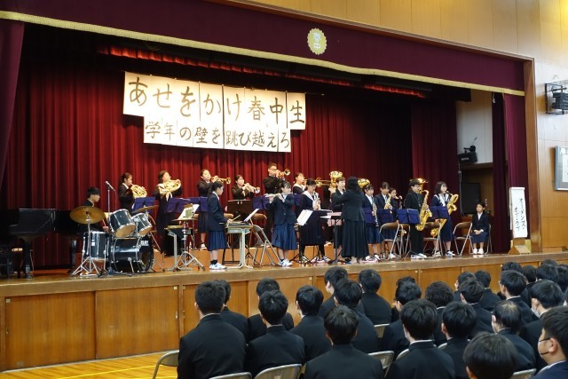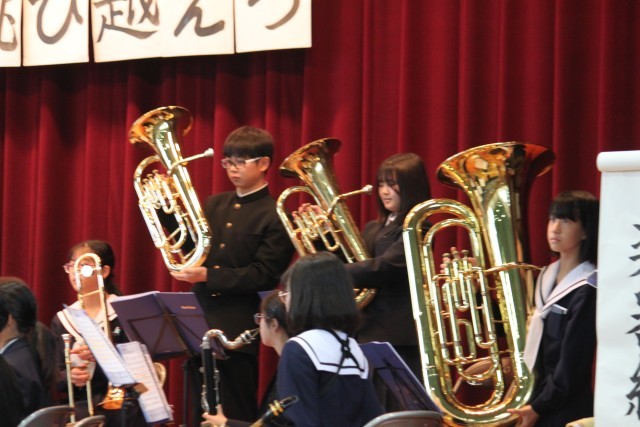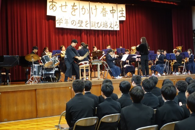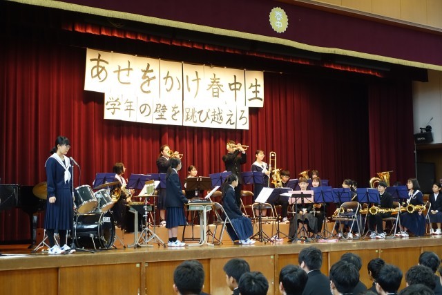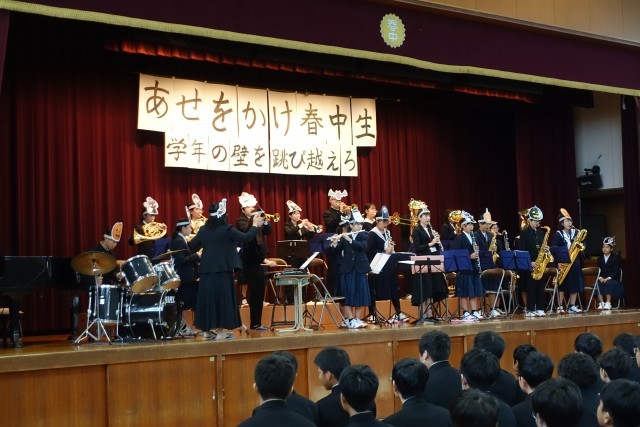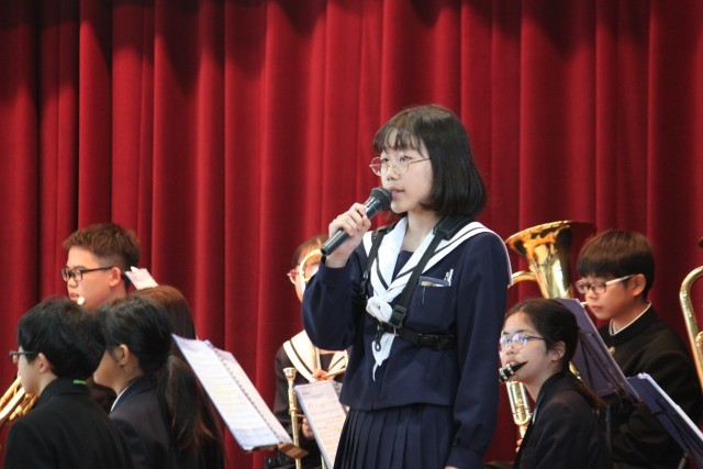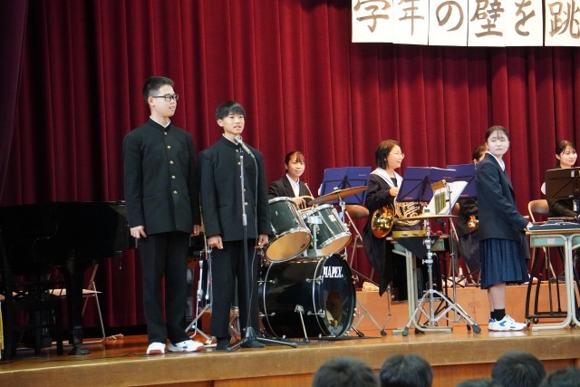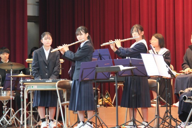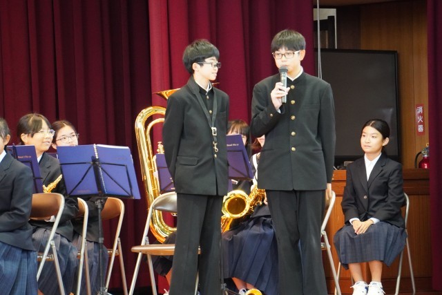 文化祭 吹奏楽部発表 10月31日 公開日 2025/11/06 更新日 2025/11/05 行事 3年生が引退して新体制での発表会。全校生徒の皆さんが楽しんで聞いてくださる曲や企画を考え、この日のために1か月間必死に準備してきました。当日は「夏祭り」や「怪獣」などの新曲や楽器紹介を加え、1・2年生全員で5曲を演奏しました。演奏だけでなく、曲紹介も堂々と発表することができました。 +7 いいね(0)