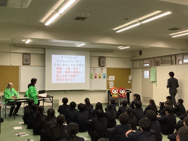 本日6時間目にて、人権擁護委員会の方をお招きし人権についてのお話をいただきました。人権と聞いて思いつくこと、想像できることが生徒たちから様々に挙がりましたが、遠い世界の話だから、自分は友達と仲が良いから、と他人事では済みません。今世の中に起きていることを自分ごととして捉え、今一度人権とは何のためにあるのか考えて欲しいと思います。