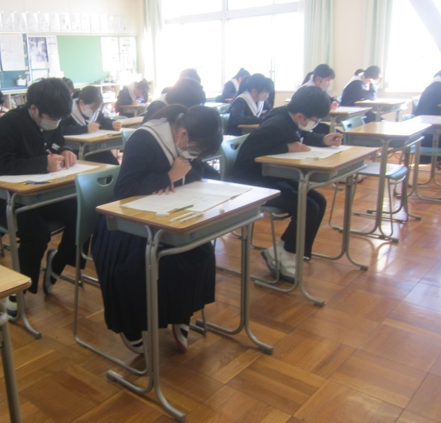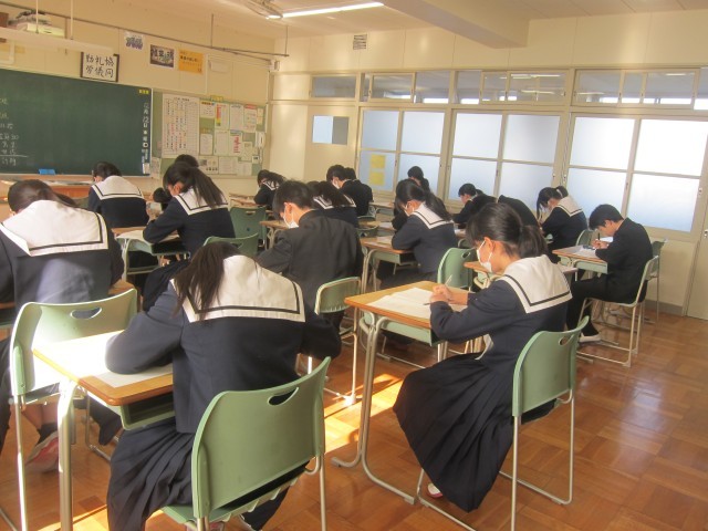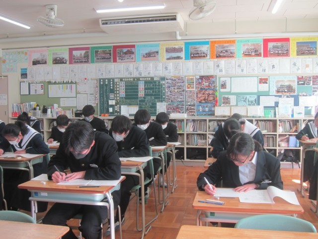 本日、第3回目実力テストを1時間目ら5時間目に行いました。これまでの学習の成果は発揮できたでしょうか。2学期も終盤となり、最近では放課の時間に過去問に挑戦したり自分の苦手を克服しようと友達や先生に質問するなど、学習に対して意欲的な生徒が多くなってきました。素晴らしいですね。できたところ、できなかったところをしっかりと確認し、復習をしましょう。