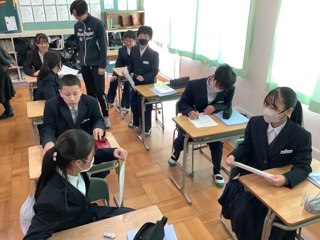 生徒一人一人が、自分宛てに友達から「よいところ」を書いてもらい、それを受け取る活動をしました。友達から自分宛てに書いてもらった「よさ」を受け取ると、友達からの言葉に笑顔を見せたり、照れくさそうにしながらも読み返したりする姿が見られ、活動は大いに盛り上がりました。