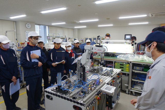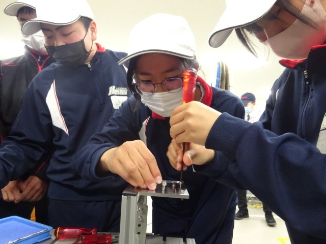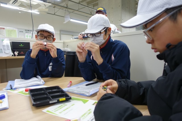 技能五輪に出場した選手やその指導員、技能五輪出場を目指す学園生等が実際に訓練を行っている現場で、電子機器組立て職種のほか、メカトロニクス職種、プラスチック金型職種の説明を聞き、一部を体験しました。