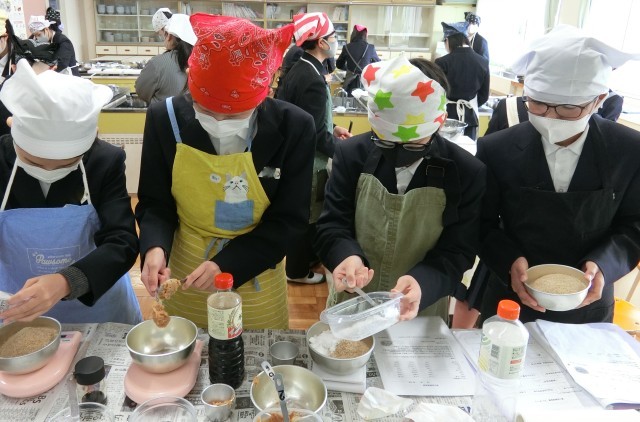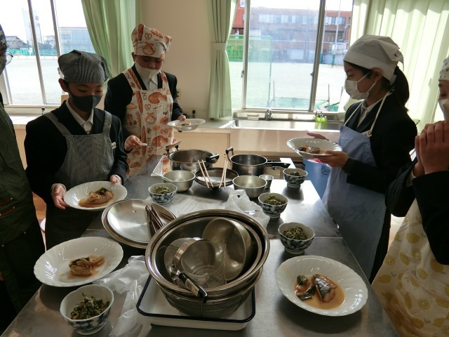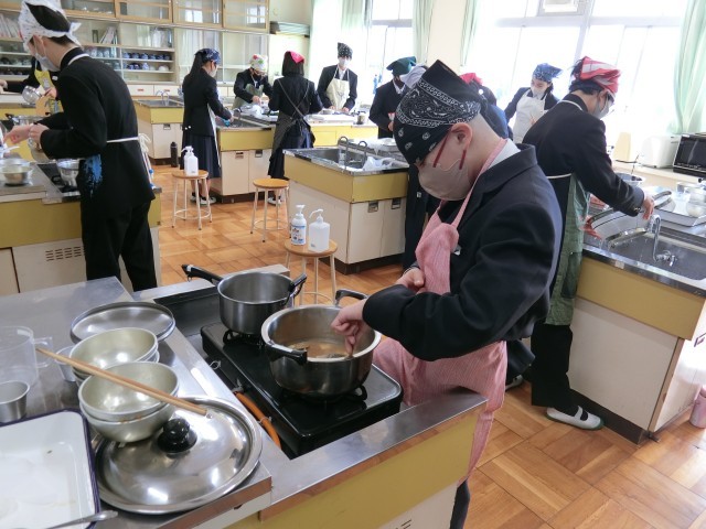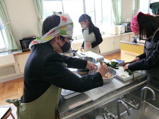 本日、1年C組が家庭科の授業で、調理実習をおこないました。メニューは、「さばの味噌煮、ほうれん草のごまあえ」です。前回の調理実習に比べ、班で役割分担をしながら効率よく調理を進めることができました。計量器を使って分量を正確に量る姿も見られ、これまでの学習の積み重ねが感じられました。ここで身に付けた調理の基礎や協力する姿勢を、今後の生活の中でも活かしてほしいと思います。