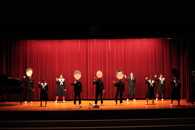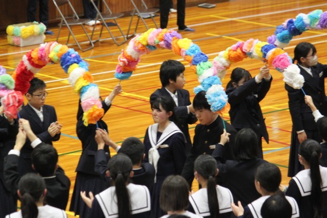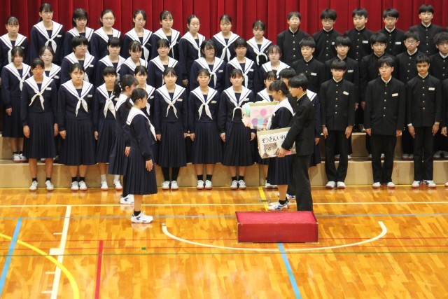 最初の出し物は、1・2年生有志による3年間を振り返る劇でした。3年生へのアンケートをもとに構成されており、自然体験学習や体育大会などの行事が次々と再現されました。場面によっては笑い声が起こるなど、温かい雰囲気で3年間の歩みを振り返る時間となりました。続いて、1年生が「大切なもの」の、2年生が「明日へ」を合唱しました。これまでお世話になった3年生への感謝の気持ちと、これからの未来へのエールを込めて心を一つにして歌いました。体育館いっぱいに広がる歌声は、3年生の心に届いたことと思います。