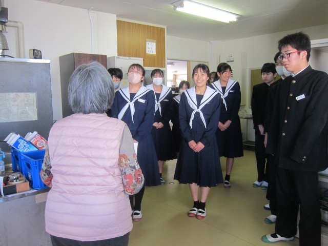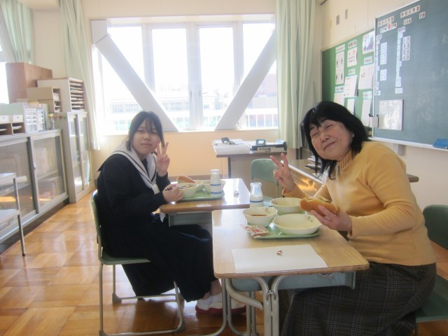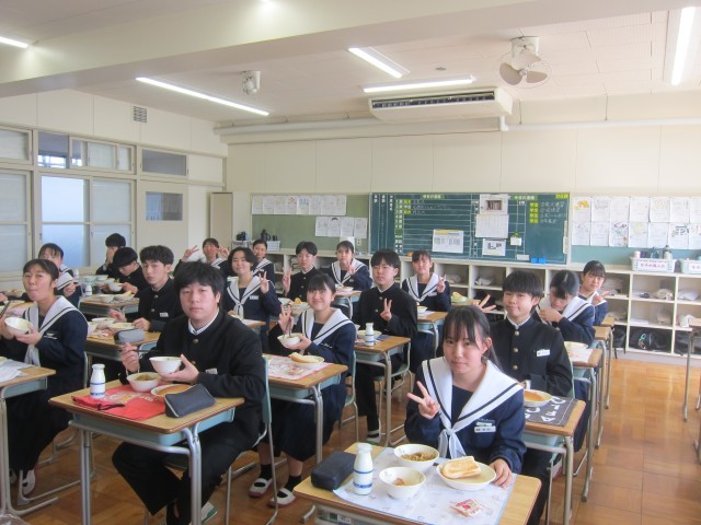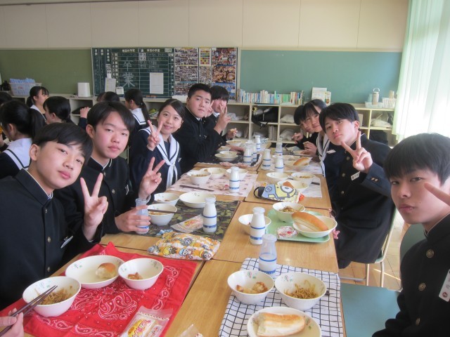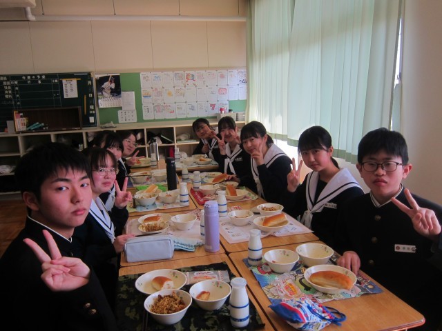 本日は、中学校生活最後の給食でした。教室では「これが最後の給食かぁ」といった声が聞こえ、クラスの仲間と楽しそうに食事する姿が見られました。また、給食の終わりには、毎日給食の準備や配膳をしてくださった用務員さんへ、代表の生徒が感謝の言葉を伝えました。