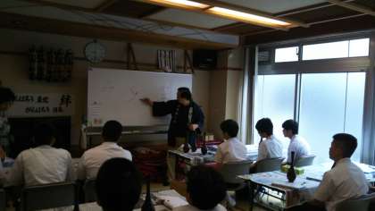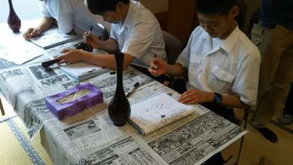 B組男子は、安宅漆工店で蒔絵に挑戦です。まず、ペンで絵を描きます。