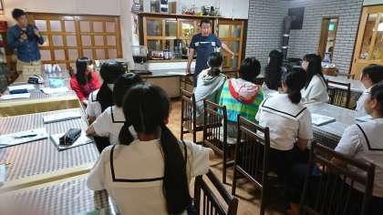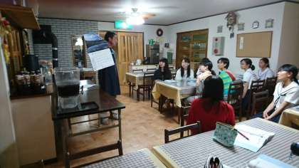美味しい食事も終わり、ふれあいタイムにてオーナーさんから河口湖の四季についてのお話を聞いています。